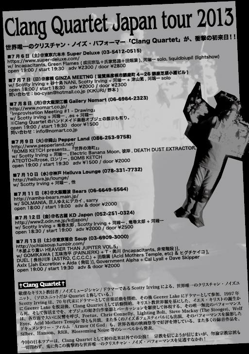 Kawabata Makoto fully support his tour. Also the members of Acid Mothers Temple and gorgeous lineups from Japanese underground music/noise scene support each shows!! Clang Quartet is sound collage, white noise, percussion and The Jesus Christ crucified and resurrection. Don't miss it!!