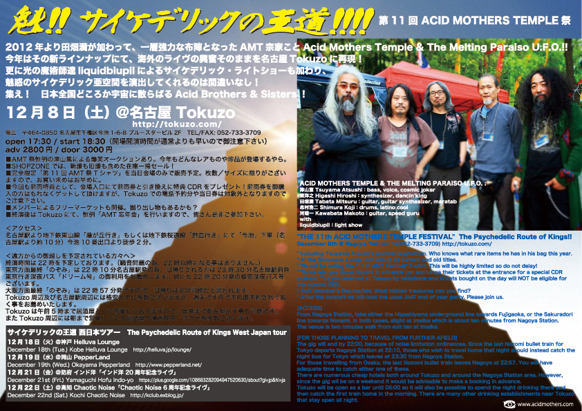 ■As of 2012 Tabata Mitsuru (Zeni Geva, AMT & The Cosmis Inferno, Leningrad Blues Machine, etc) has joined the new five-piece line-up ACID MOTHERS TEMPLE & THE MELTING PARAISO U.F.O. as our guitarist. Higashi Hiroshi has moved to concentrate solely on synth.